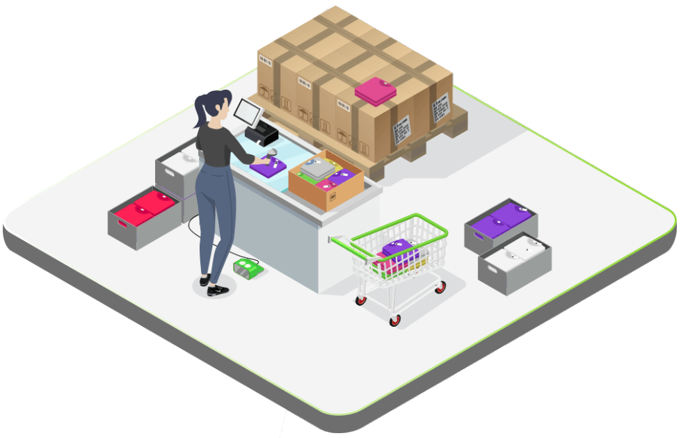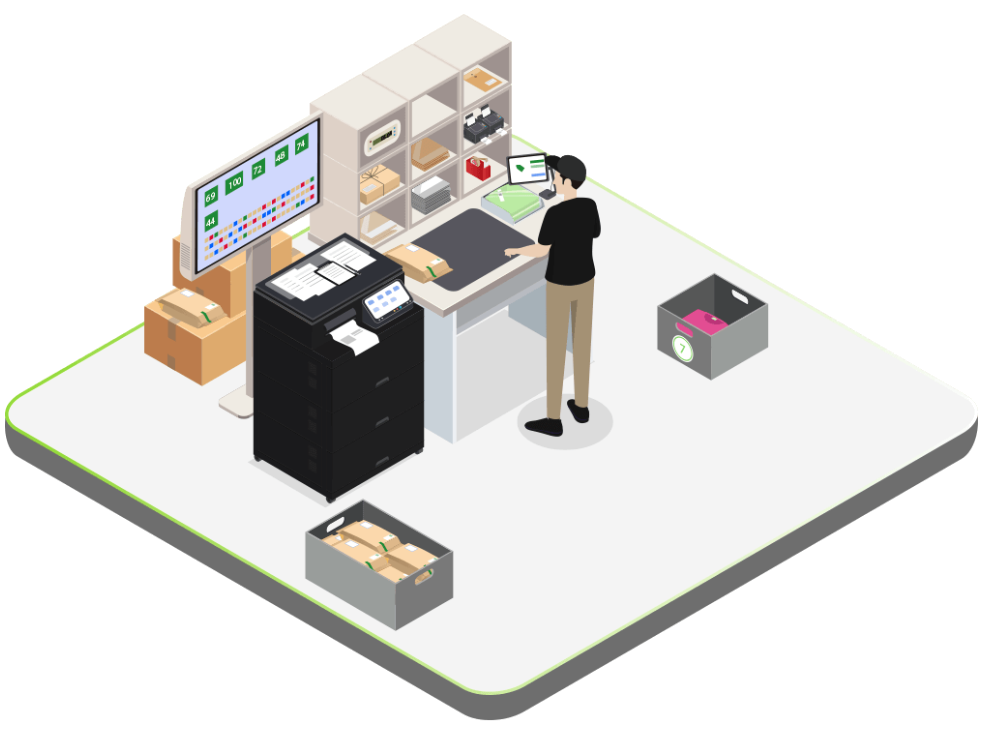A terminal records incoming blank inventory to ensure that blanks are properly accounted for and immediately placed into production, or placed in the warehouse for picking as needed. At this station, blanks receive a QR code sticker which is scanned at every terminal in the production process to complete the order. Each station communicates with the operator and the production equipment to allow for high-speed processing.