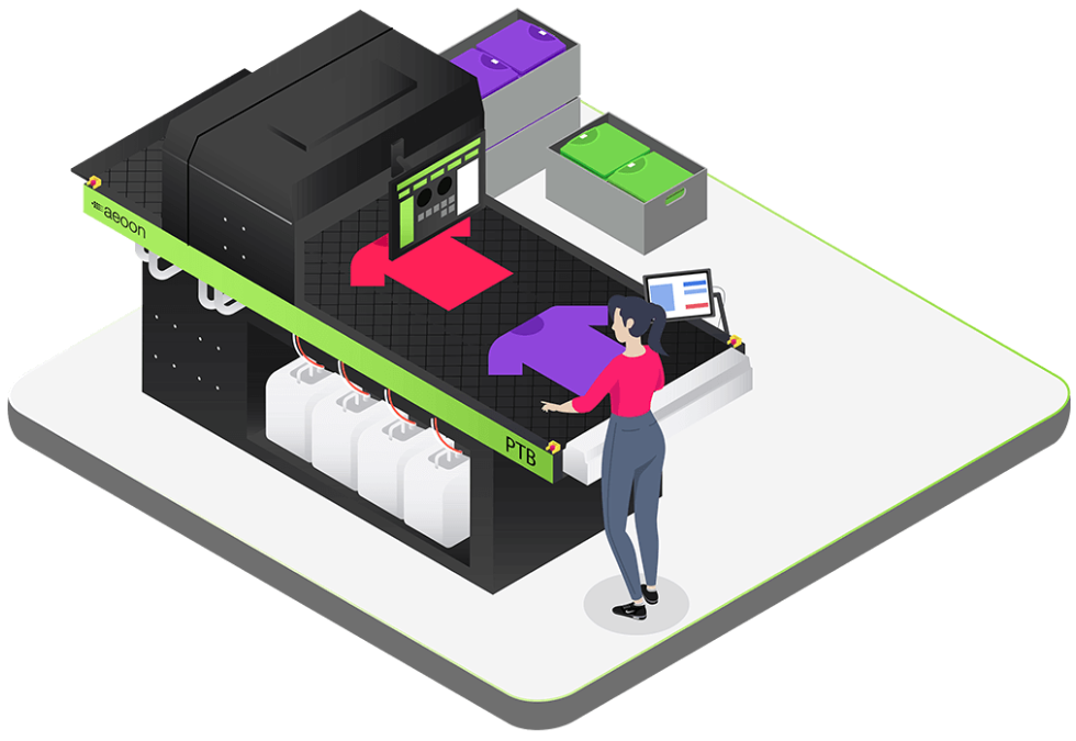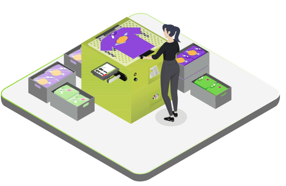 The system automatically uploads art files to the printer and shows the operator the blank color, style, size, and print location. This is accomplished by scanning the QR code on the blank. This easy-to-use system allows the printer to operate at the full speed even though every blank may require different artwork. Perfect for one-off print-on-demand production without errors or wasting operator time reading instructions.