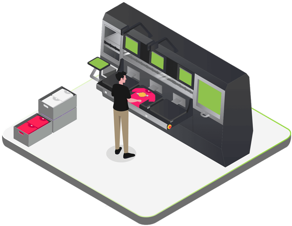 When garments are part of a larger order, the system notifies the operator to place the garment in a numbered bin while it waits for each item in the order to be completed. Once all items in the order have passed quality control, the system instructs the operator to pull and scan every item in the assigned bin associated with the order, and prepare the order for shipping.